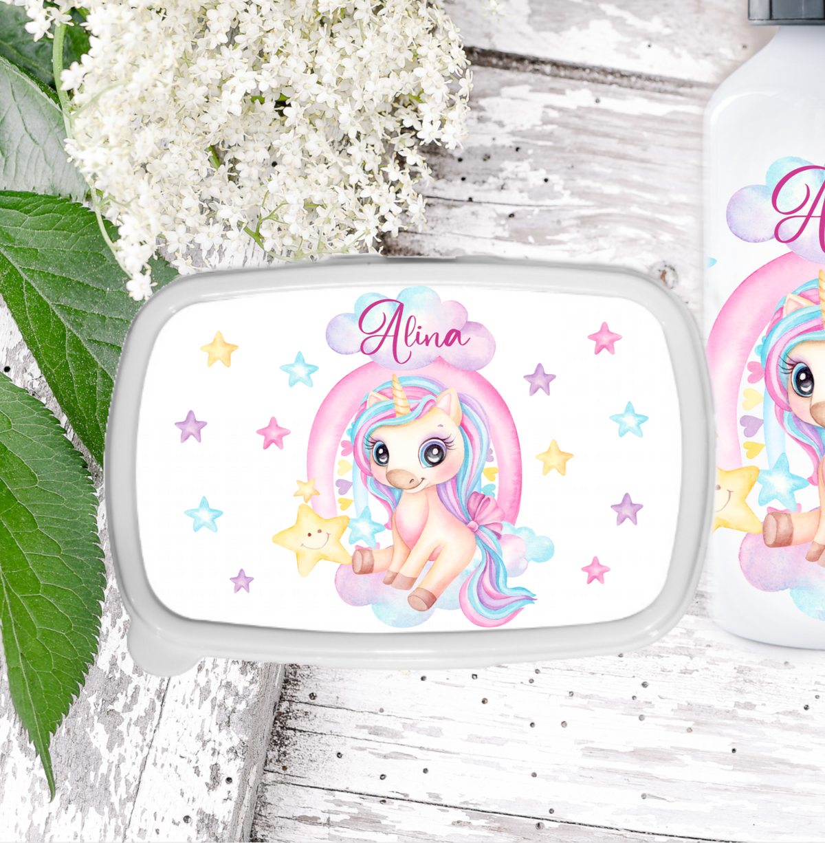 Zusammen mit einer passenden Trinkflasche mit Namen gibt es die Brotdose mit Namen auch als Set --> siehe Kategorie "Sets".