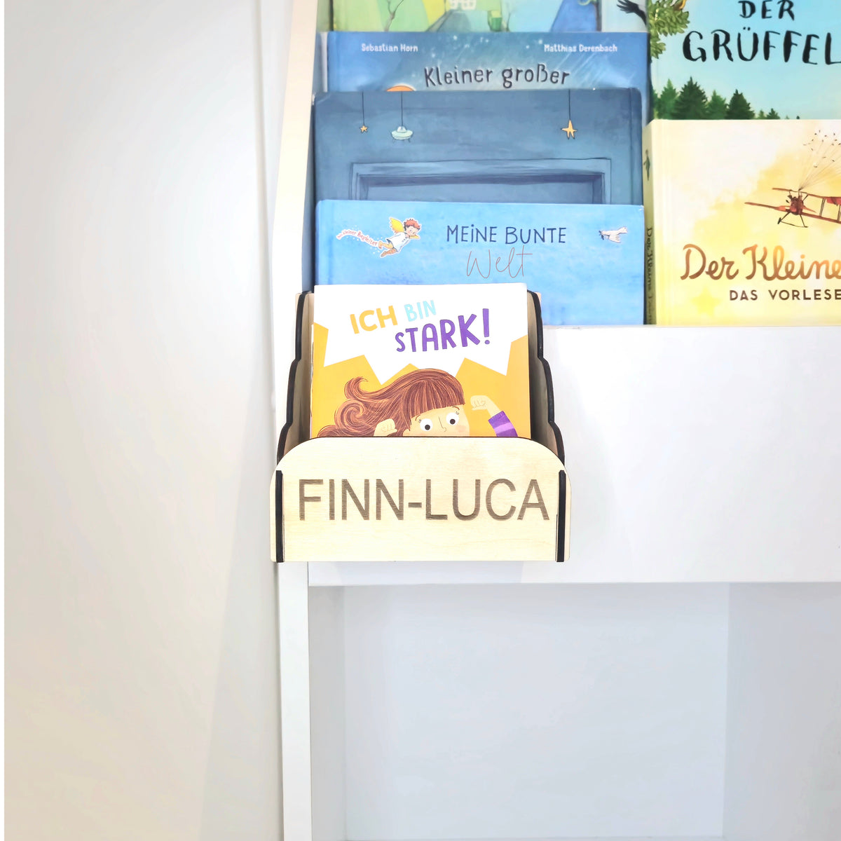 Unser Bücherregal besticht durch seine natürliche Holzoptik. Die Symbole und der Name werden von uns präzise in das Holz graviert, wodurch es dem Kinderzimmer eine warme und natürliche Atmosphäre verleiht.