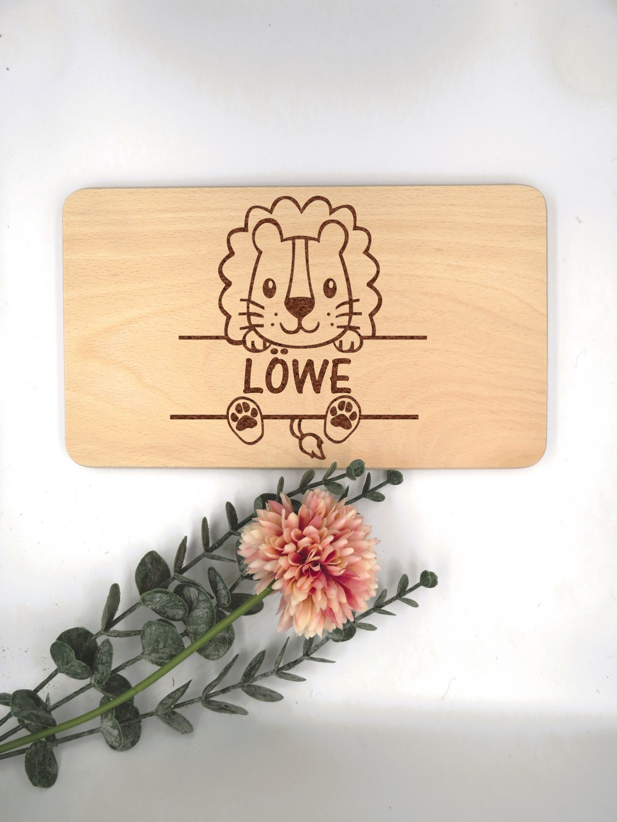Das Frühstücksbrett ist zuckersüß, denn es ist graviert einem Löwen, der ein Schild mit dem Namen des Kindes festhält.