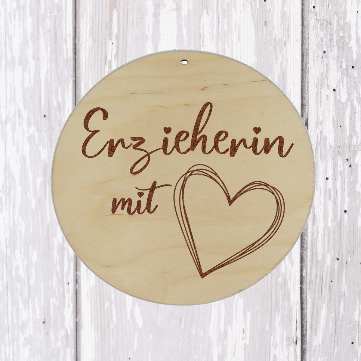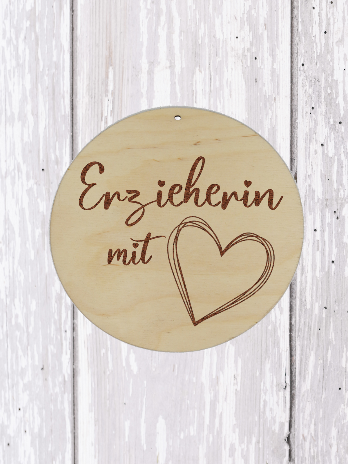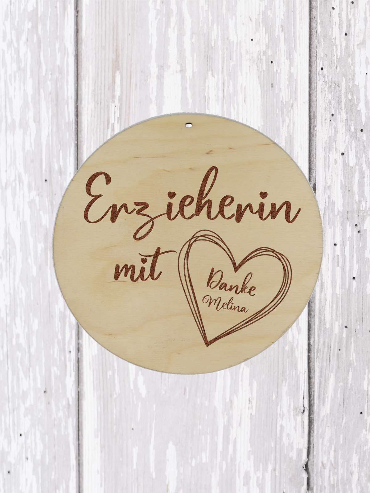 Mit der Gravur "Erzieherin mit Herz" ist dieses Deko Holzschild eine liebevolle Art, um einer Erzieherin für ihre wertvolle Arbeit und Hingabe zu danken.