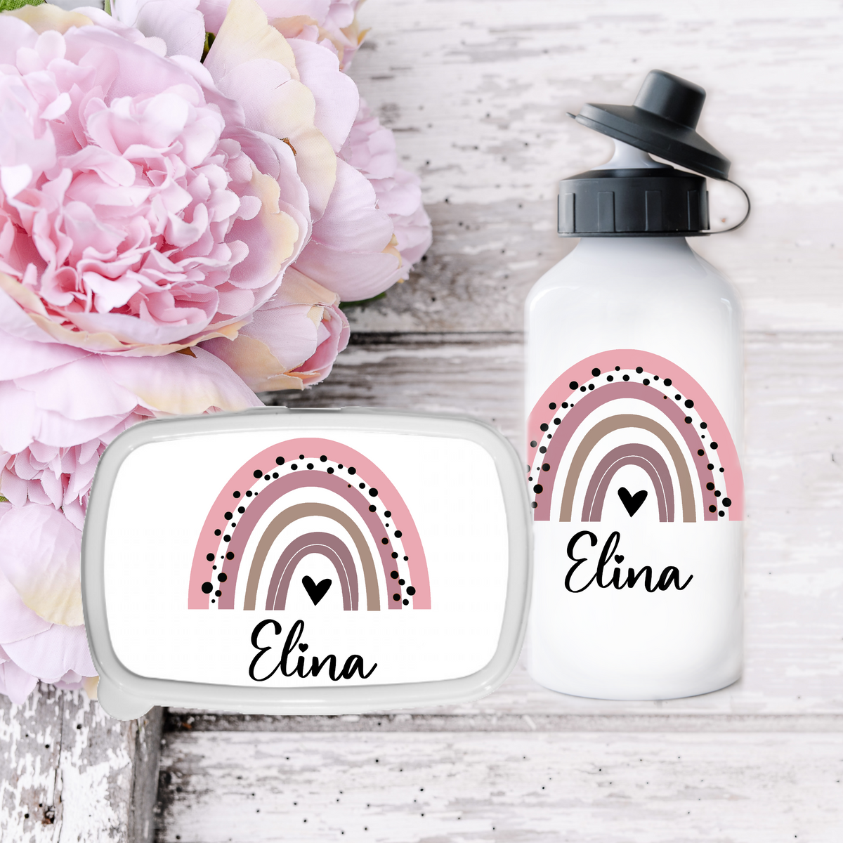 Diese personalisierte Brotdose und Trinkflasche für Kinder ist ein ganz besonderes Geschenk, denn du kannst sie mit einem Wunschnamen gestalten.