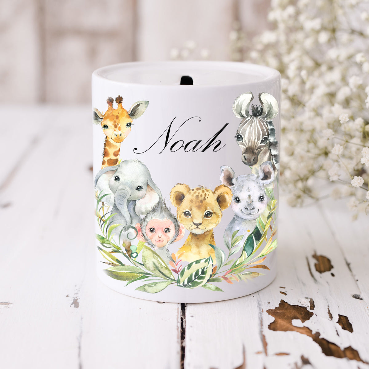 Diese personalisierte Spardose für Kinder ist ein ganz besonderes Geschenk, denn du kannst sie mit einem Wunschnamen gestalten.