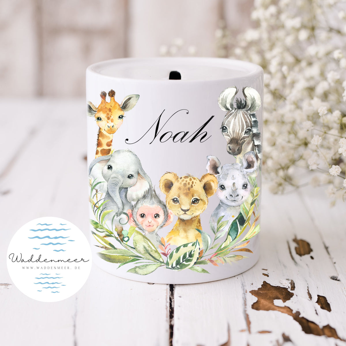 Die Spardose mit eigenem Namen ist eine besondere Dekoration im Regal des Kinderzimmers und ein sehr praktisches, aber vor allem persönliches Geschenk für Kinder und Babys.