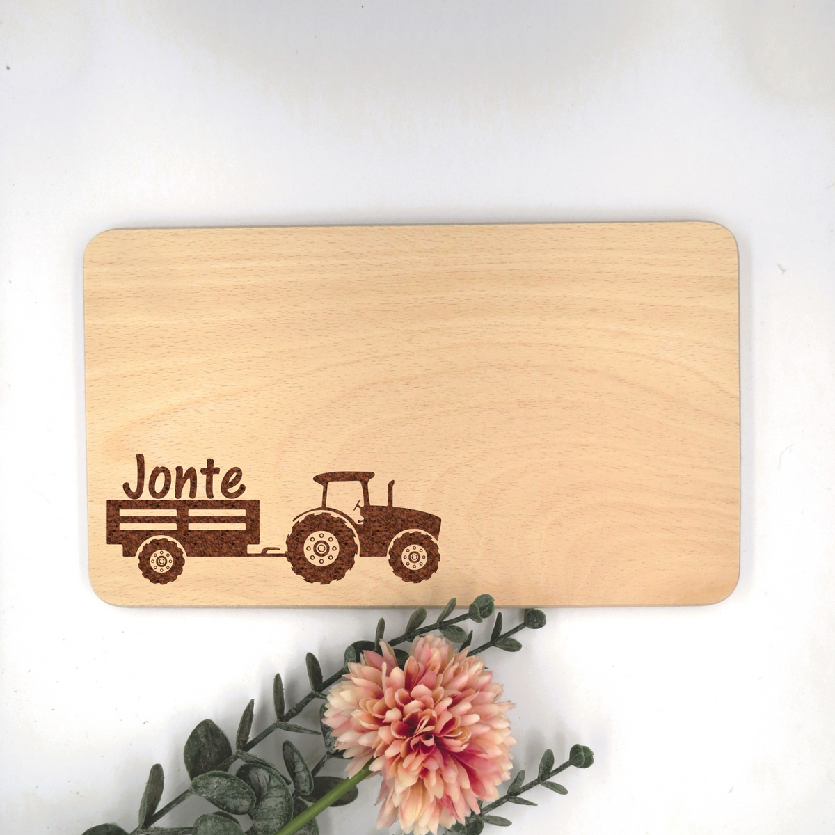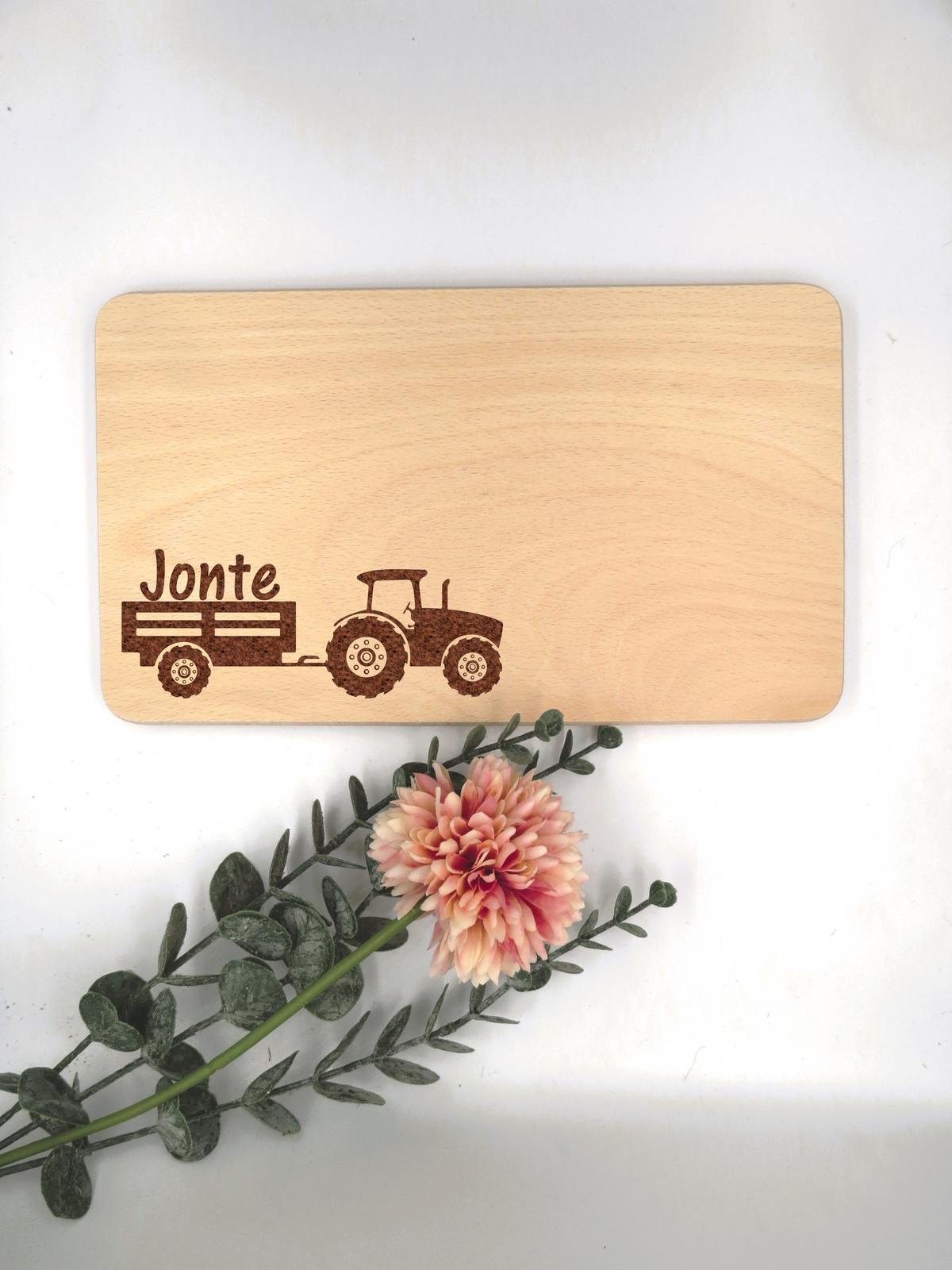 Das Frühstücksbrett ist für echte Treckerfans, denn es ist graviert einem Trecker mit Anhänger und dem Namen des Kindes.