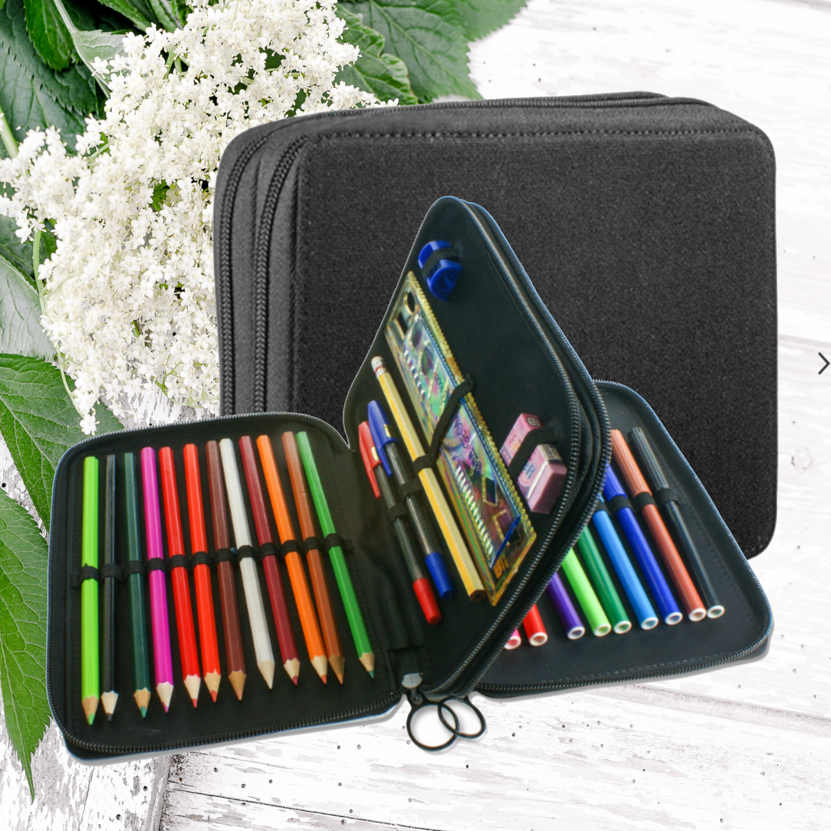 Die Federtasche wird mit dem abgebildeten Inhalt, wie Stiften, Anspitzer, Lineal, Bleistift, Radiergummi, etc. geliefert.