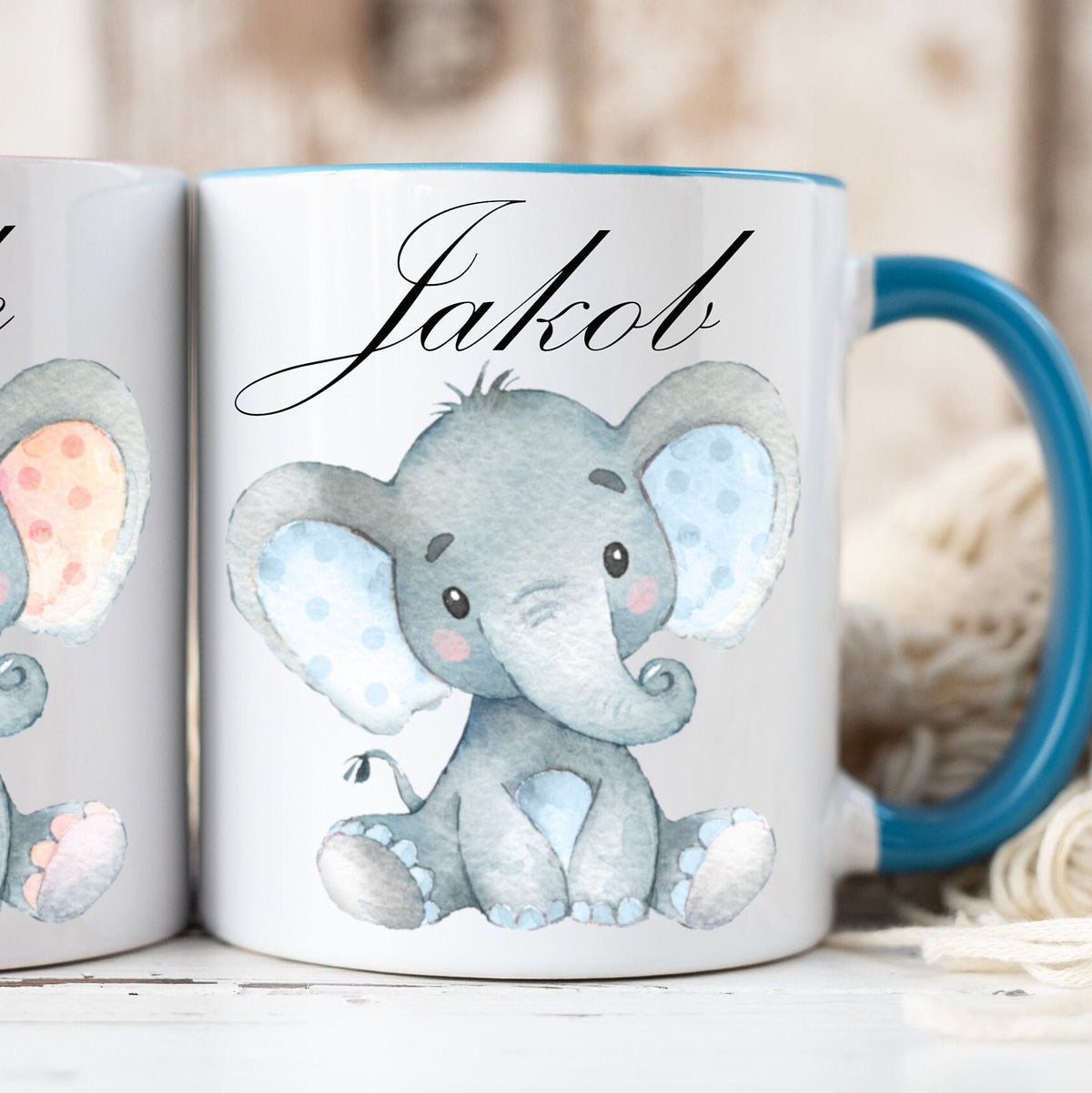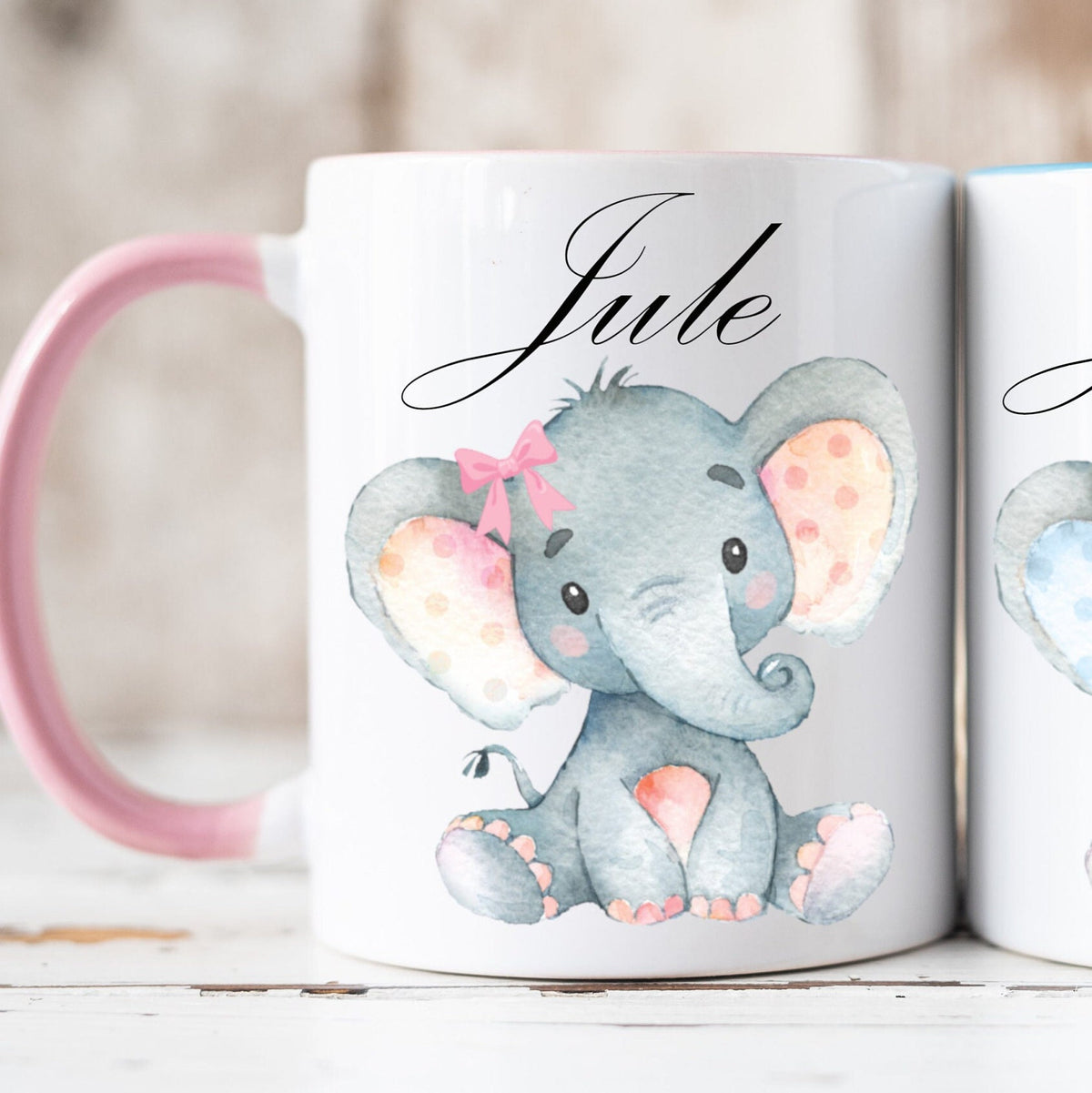 Personalisierter Trinkbecher mit rosa oder blauem Griff.