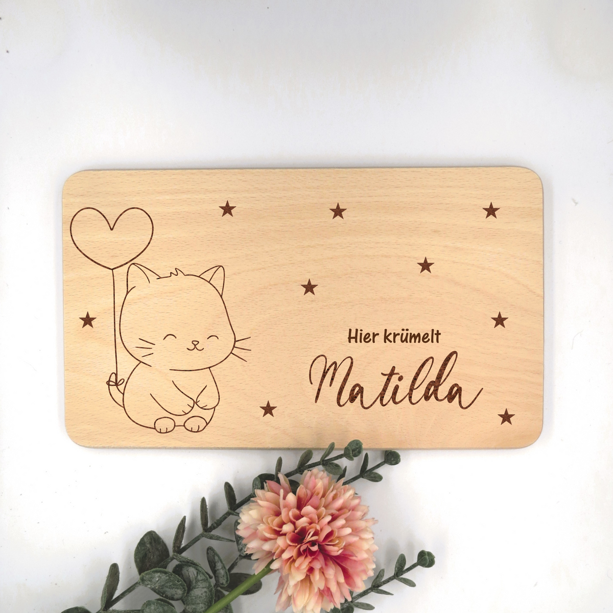 Das Frühstücksbrett ist zuckersüß, denn es ist nicht nur graviert mit "Hier krümelt" und dem Namen des Kindes sondern auch mit einer süßen Katze und Sternen.
