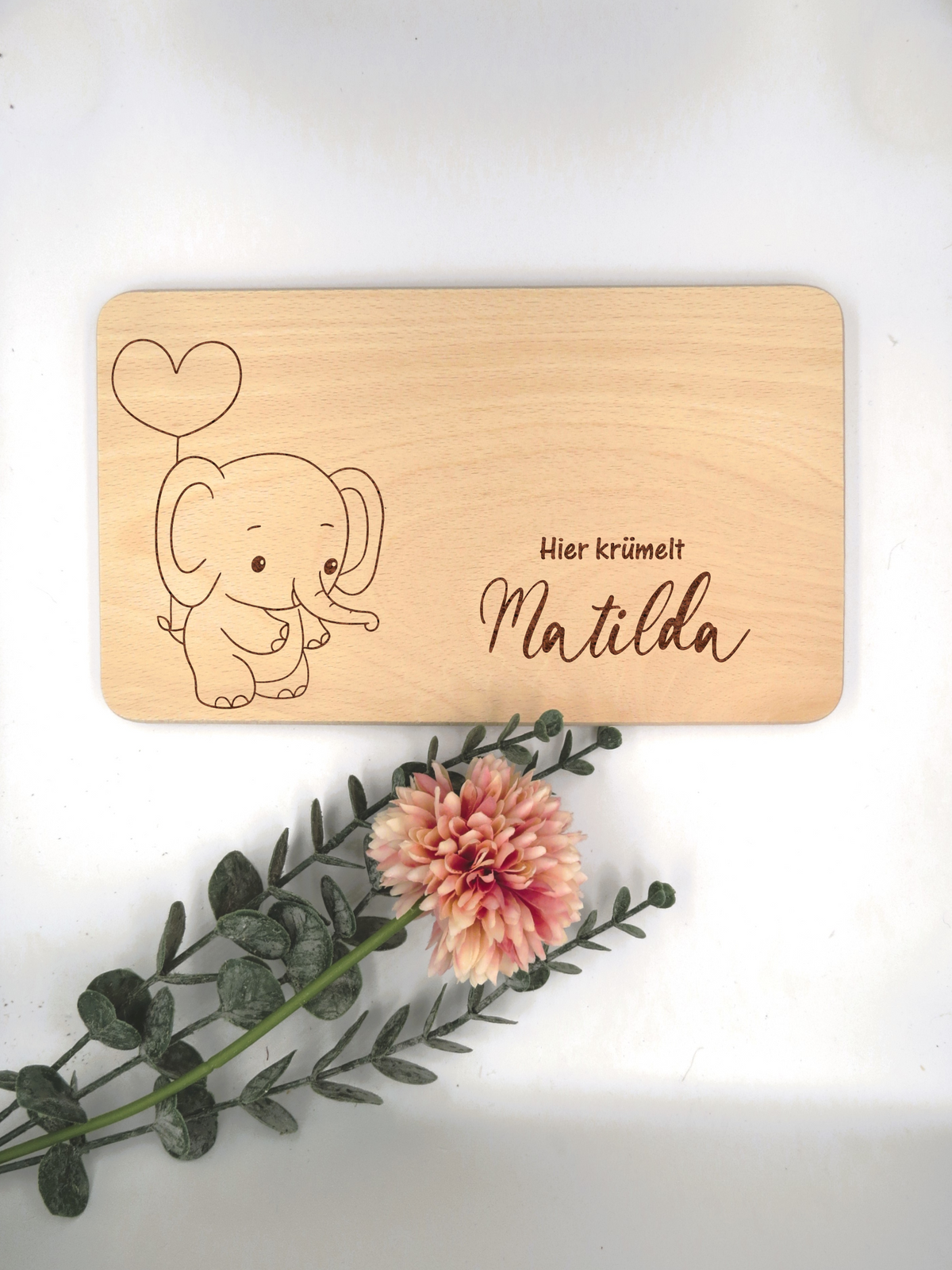 Das Frühstücksbrett ist zuckersüß, denn es ist nicht nur graviert mit "Hier krümelt" und dem Namen des Kindes sondern auch mit einem süßen Elefanten.